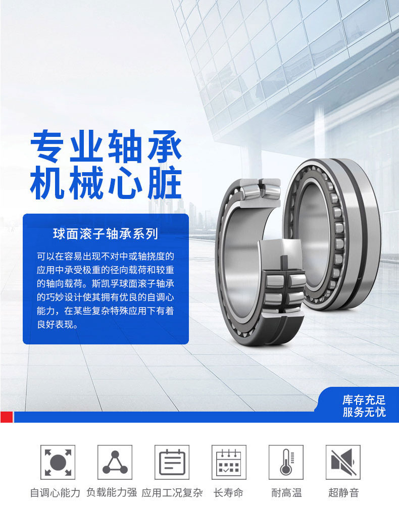 SKF球面滾子軸承的滾子的制造極為嚴格的公差尺寸和形式。每個輥子在集合中的其它輥的尺寸和形狀幾乎是相同的。優(yōu)化負荷分布輥軸承的使用壽命**化。