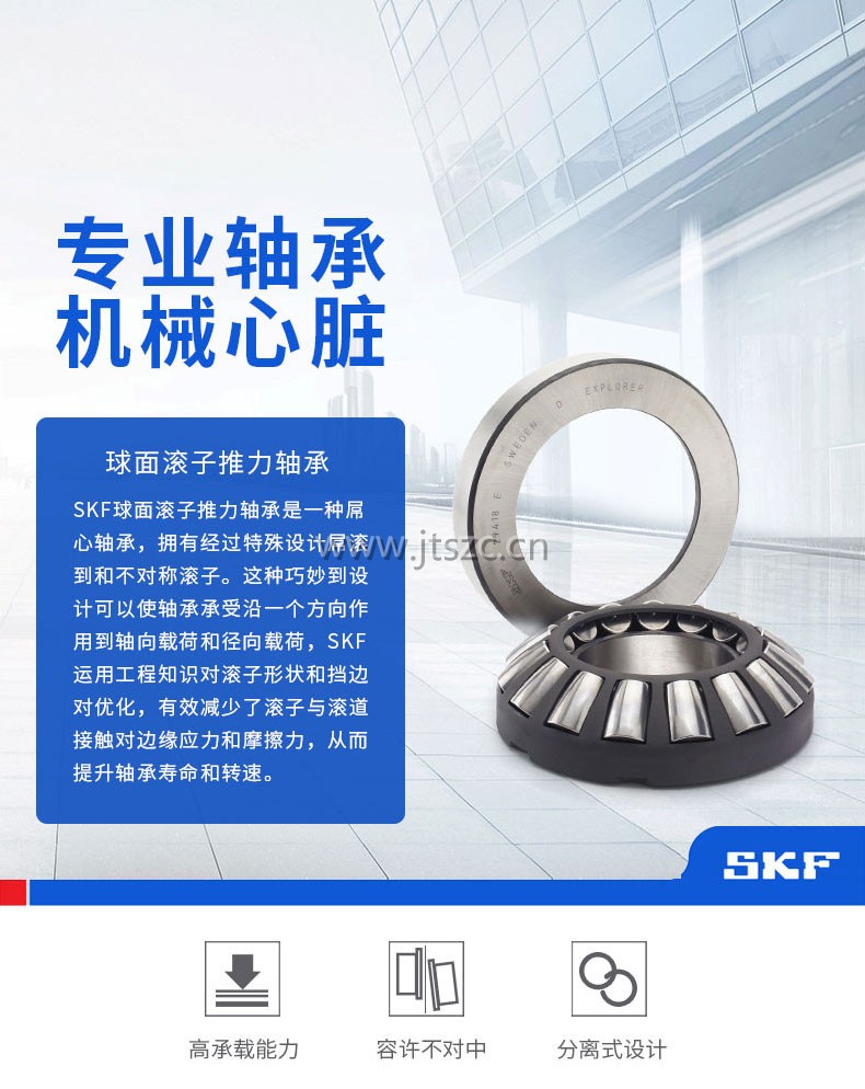 推力滾子軸承是用于承受軸向載荷為主的軸、徑向聯(lián)合載荷,但徑向載荷不得超過軸向載荷的 55% 。與其他推力滾子軸承相比,此種軸承摩擦因數(shù)較低,轉(zhuǎn)速較高,并具有調(diào)心性能。